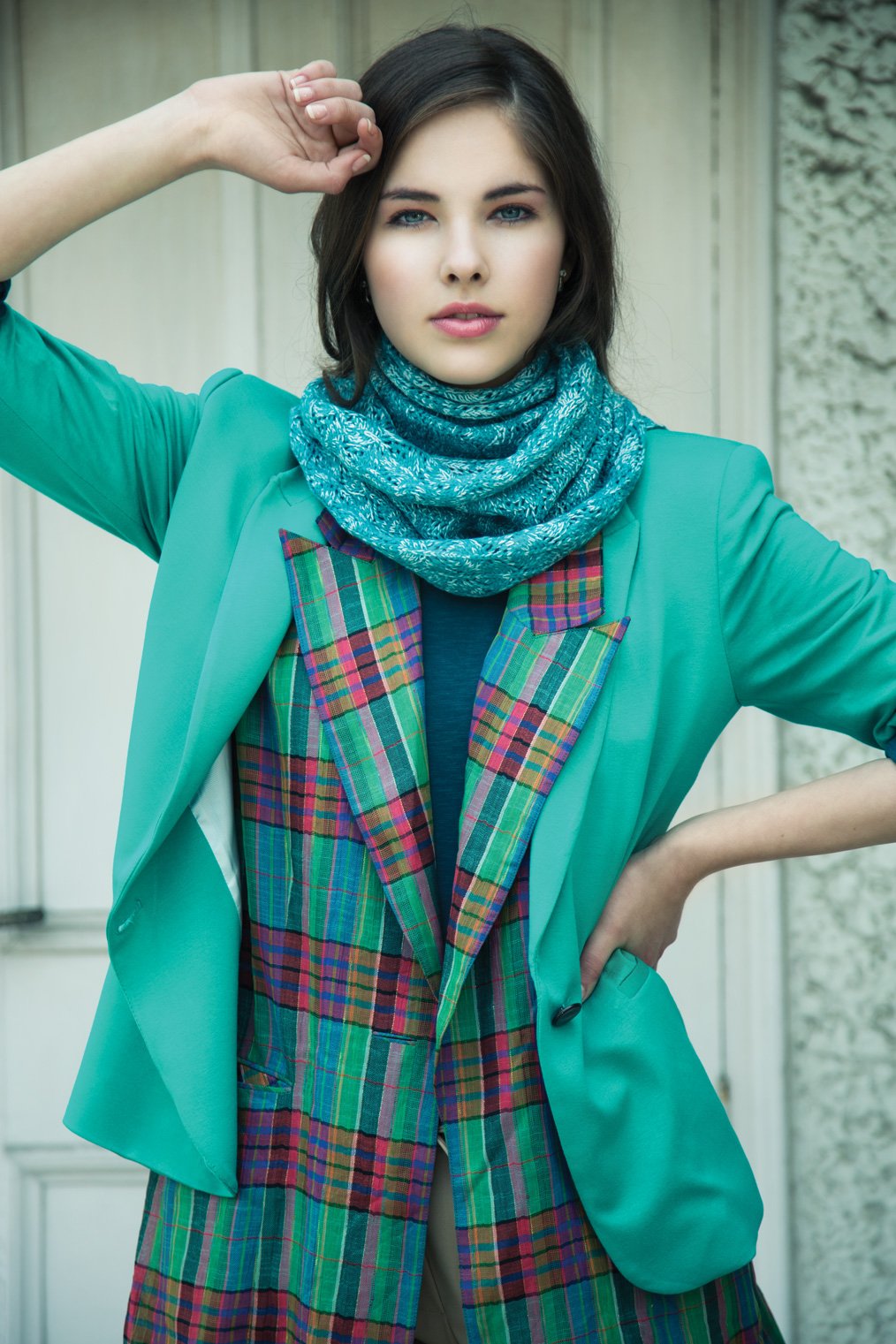 Trouser and turquoise blazer, Zara; scarf and pumps, Elle; checked blazer and teal t-shirt, stylist’s own